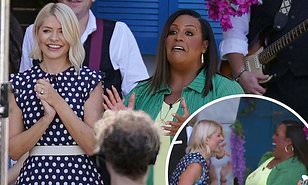 The 42-year-old, smiling effusively in a black and white polka dot dress, was seen dancing along to a rendition of ABBA's Dancing Queen by the cast of Mamma Mia The Party before embracing her fellow presenter Alison Hammond.